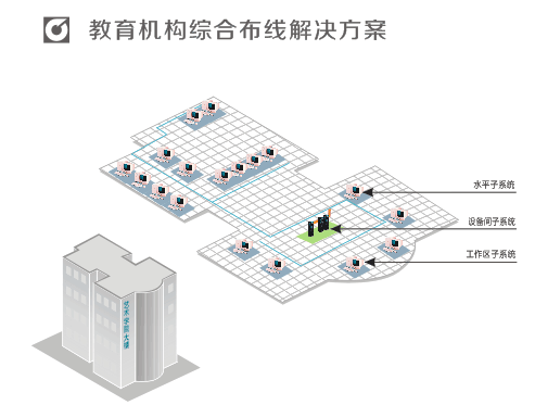 教育机构综合布线建设总体目标是:以“统一规划、分步实施、加强应用、整合资源、共享数据”为指导思想,建设较完善的数字化的网络环境、数字化的教学资源、数字化的教学与学习环境、数字化的管理手段和工作环境,实现数字化的学习、教学、科研和管理,创建数字化的生活空间,推动我院制度创新、管理创新,最终实现教育信息化、决策科学化和管理规范化,达到提高教育教学质量和效率的目的,在建设初始就应当受到高度的重视。索尔提供广泛的布线产品给那些利用新技术的教育机构例如分布式交互技术和IP技术,从小的校园到大的大学学院网络。索尔提供高速数据及语音连接方案,方便的连接办公、教室和宿舍等。