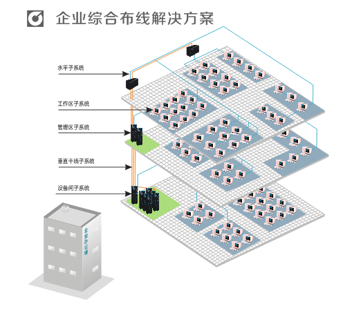 企业综合布线特点: 兼容性:可以适用于多种应用系统。 开放性:符合多种国际上现行的标准,并支持所有通信协议。 灵活性:模块化设计,所有通道都是通用的。 可靠性:高标准的信息传输通道,以保证其电气性能。 先进性:所有布线均应采用世界上最新通信标准,并提供足够的余量。 经济性:统一设计,统一施工,统一管理,避免重复劳动和设备占用。 可维护性:系统设计应科学合理,做到维护简单、方便。 推荐使用产品 Cat 5E、Cat6、 Cat6A、Cat7